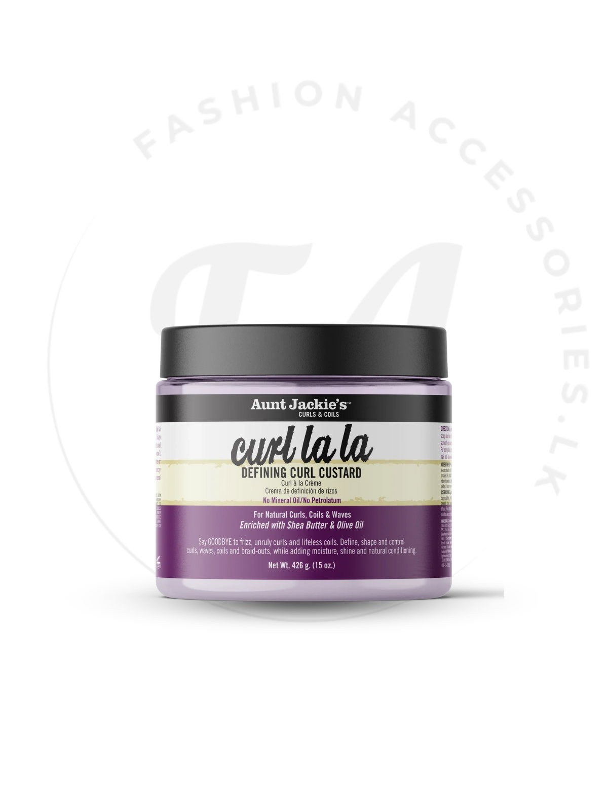Aunt Jackie’s Curl La La Defining Curl Custard ඔබේ කර්ලි, කොයිල් සහ වැව් හැඩ ගස්වා පාලනය කරමින් frizz අඩු කරයි. Shea Butter සහ Olive Oil සමඟ සම්පූර්ණ කළ මෙම පොෂණයුක්ත ක්රීම් එක, හිසකෙස් මූල සිට අග දක්වා තෙතමනය සහ දීප්තිය ලබා දෙයි.මෙම custard එක ඔබේ කර්ලි, වැව්, කොයිල් හෝ braid-outs සම්පූර්ණයෙන්ම නිවැරදි හා මෘදු බවට ගෙන ඒමට උපකාරී වේ, හිසකෙස් බරපතල හෝ රබසකින් යුත් නොවී.Sulfates, Parabens, Mineral Oil සහ Petrolatum නොමැතිව නිර්මාණය කර ඇති මෙය ස්වභාවික හා පිරිසිදු සැරසිලි විසඳුමක් සොයන අයට සුදුසු වේ.