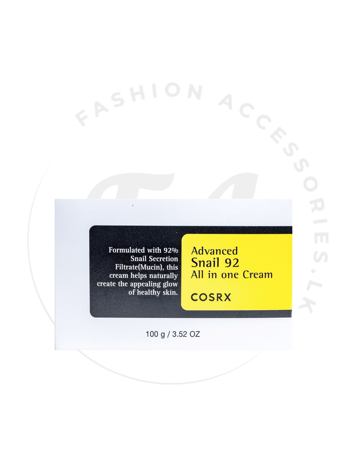 COSRX Advanced Snail 92 All-in-One Cream යනු 92% සෙප්රෂන් ෆිල්ට්රේට් (snail secretion filtrate) සමග සම්පූර්ණ කර ඇති බහුක්රියාකාරී මොයිස්චරයිසර් එකකි. මෙය සම ආර්ද්ර කරමින්, ස්ථායීභාවය වැඩි කරමින්, සුළු රේඛා අඩු කරමින් සහ කනස්සල්ල මෘදු කරමින් සෞඛ්ය සම්පන්න සහ දිලිසෙන පෙනුමක් ලබා දෙයි. ඉක්මනින් අවශෝෂණය වන, තෙල් රහිත ෆෝමියුලා සියලුම සම වර්ග සඳහා සුදුසුය.