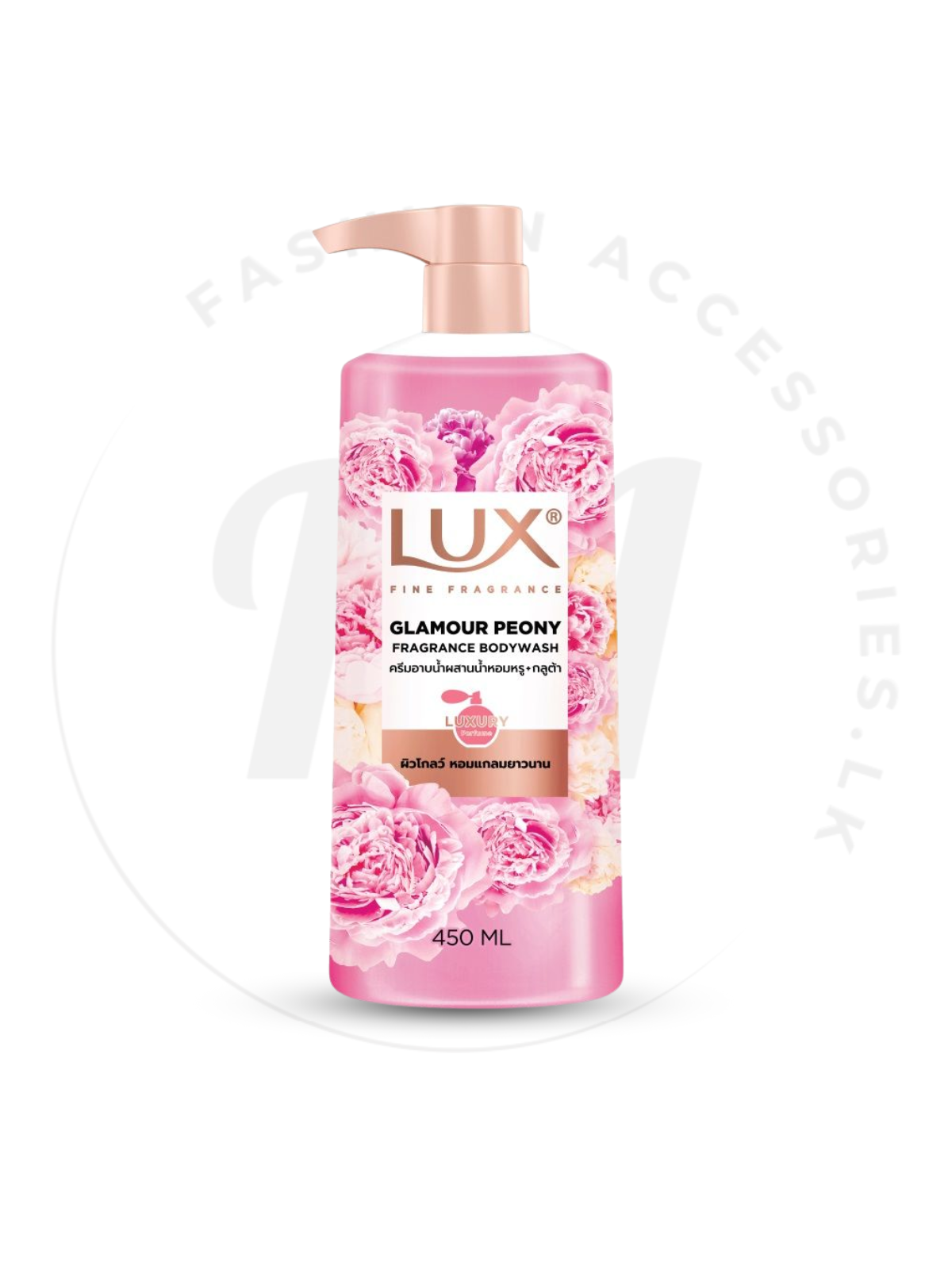 LUX Glamour Peony Fragrance Body Wash ඔබගේ දෛනික නාන කාලය luxury අත්දැකීමක් බවට පරිවර්තනය කරන, උසස් peony සහ rose මල් සුවඳින් සම්පූර්ණ කළ premium body wash එකක්. මල ගැමි සුවඳ සහ මෘදු泡 cleansing formula එක සම මෘදුව, මෘදුසුවද සහ දිගුකාලීන සුවඳින් පිරුණු බවට පත් කරයි. එය දෛනික භාවිතයට සුදුසු gentle composition එකක් වන අතර spa-like relaxing experience එකක් ලබා දෙයි. 450ml pump bottle එක භාවිතයට ඉතා පහසුයි.