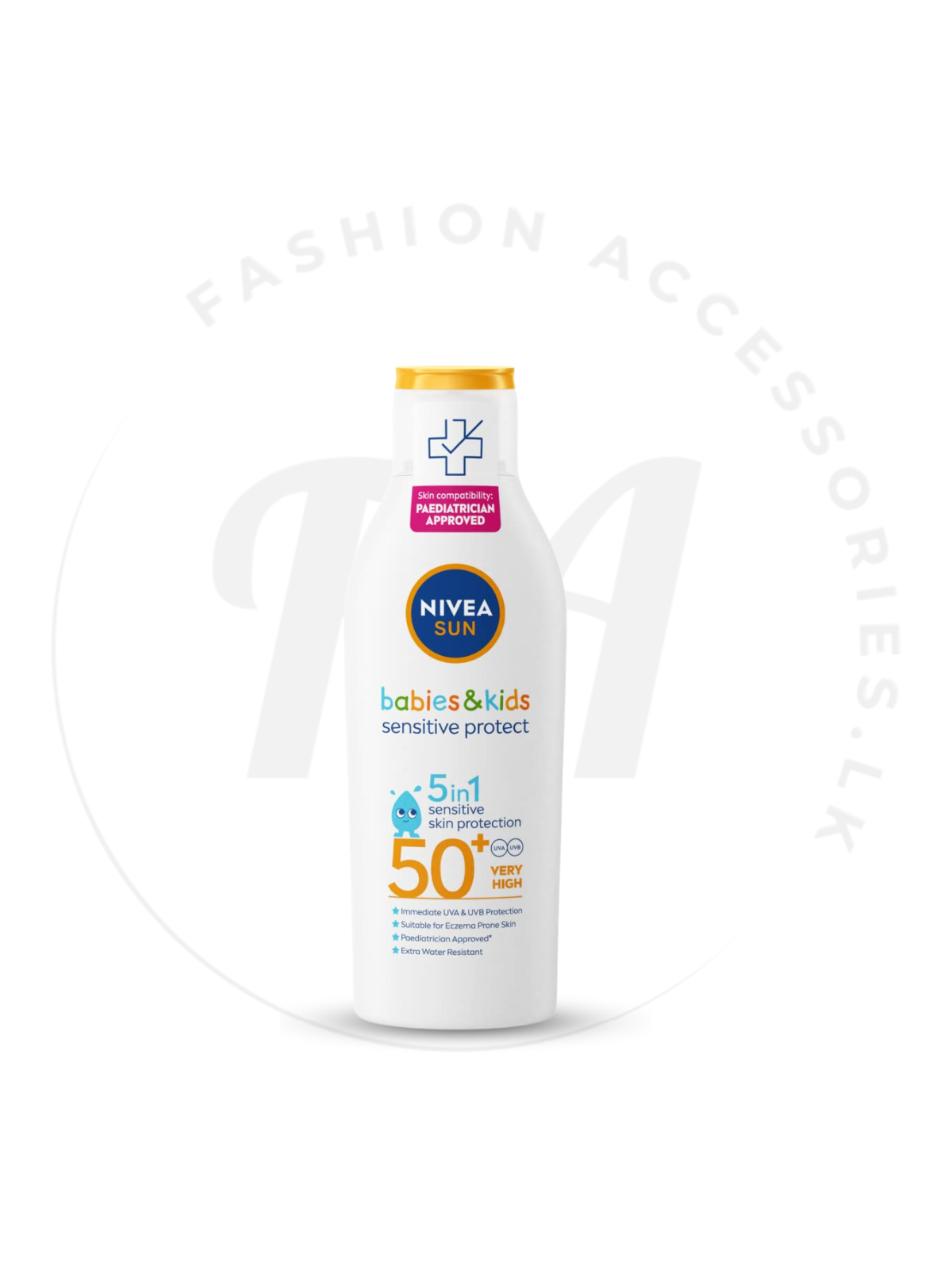 NIVEA SUN BABIES & KIDS PROTECT & SENSITIVE SUN CREAM 200ML provides highly effective UVA and UVB protection to help prevent sunburn and long-term sun-induced skin damage, while also reducing the risk of sun allergies. Specially formulated for sensitive skin, it is enriched with Organic Chamomile, fragrance-free, and extra water-resistant. Paediatrically approved, it is also suitable for eczema-prone skin.