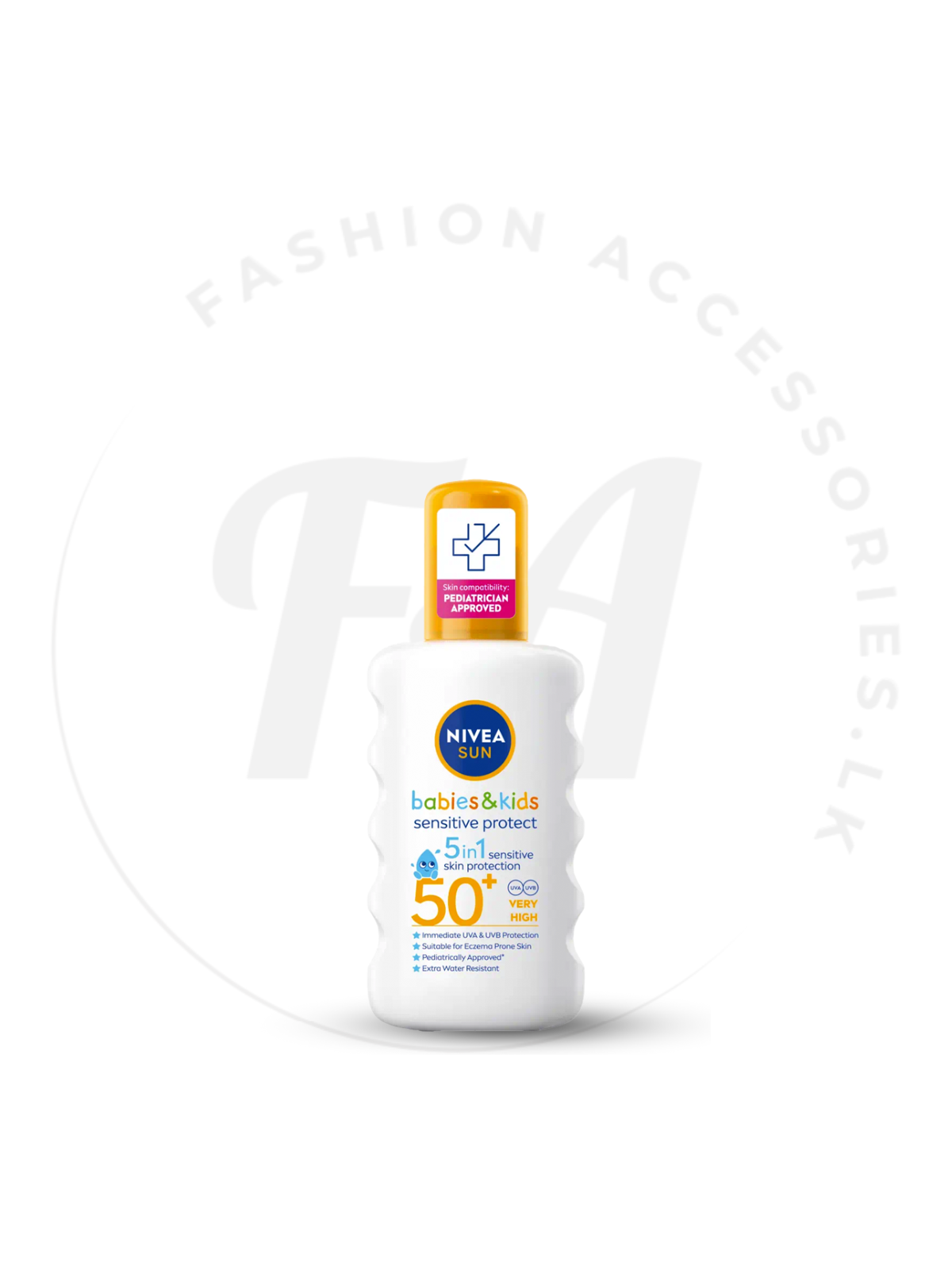 NIVEA Sun Babies & Kids Sensitive Protect Spray SPF 50+ is a spray sunscreen developed for babies and children (6+ months), offering broad-spectrum SPF 50+ protection. Specially formulated for sensitive and atopic-prone skin, it’s fragrance-free, dermatologist- and pediatrician-approved, and enriched with organic chamomile extract to soothe skin.