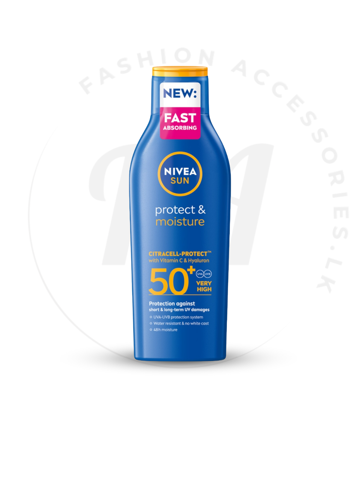 Nivea Sun Protect & Moisture Lotion SPF50+ යනු දිගුකාලීන ආරක්ෂාව සහිත සුර්ය ආරක්ෂක ලොෂන් එකකි. Vitamin C සහ Hyaluronic Acid එකතුවක් (CITRACELL-PROTECT™) සමේ ගැඹුරු ස්ථර ශක්තිමත්වය වැඩි දියුණු කරයි.