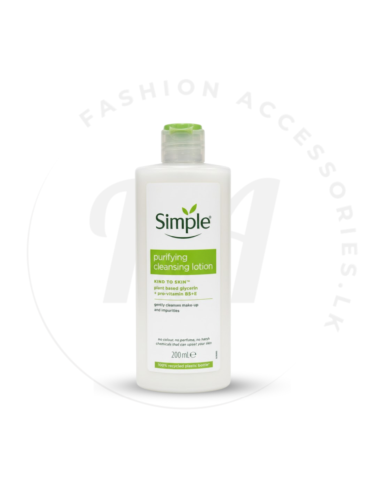 ඔබේ සම පිරිසිදු, හිනා සහ healthy වෙද්දි — ඔබත් හොඳින්ම mahansiyen feel වෙයි. Simple Purifying Cleansing Lotion යනු dry & sensitive skin සඳහා specially දියුණු කරන ලද මෘදු cleanser එකකි.Pro-Vitamin B5, Bisabolol, Allantoin මගින් සම softness, smoothness සහ soothed feel එකක් ලබා දෙන අතර dirt, makeup, pollution buildup gentle ලෙස ඉවත් කරයි.උදේ සහ රාත්රියේ භාවිතා කිරීමට සුදුසුයි, මෘදුම sensitive skin එකක් සඳහා වුවත් perfect.