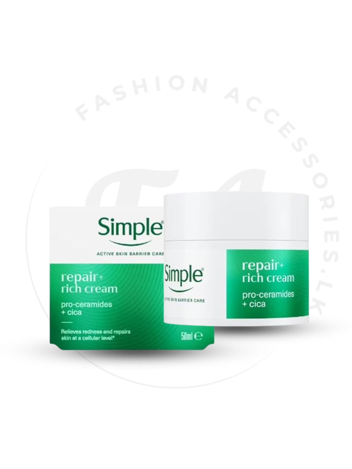 Simple Repair+ Rich Face Cream යනු සංවේදී, වියලි හෝ barrier damage ඇති සම සුවපත් කිරීමට නිර්මාණය වූ අතිශයින් බලවත් moisturiser එකකි. Pro-ceramides සහ cica එකතුව සමේ සෞඛ්යමය repair ක්රියාවලිය වේගවත් කරයි, රතුබව අඩු කරයි, hydration වැඩි කරයි, සහ සම වඩා ශක්තිමත් හා දිලිසෙන ලෙස පෙනෙන බැවින් පළමු භාවිතයෙන්ම වෙනසක් දක්නට ලැබේ.