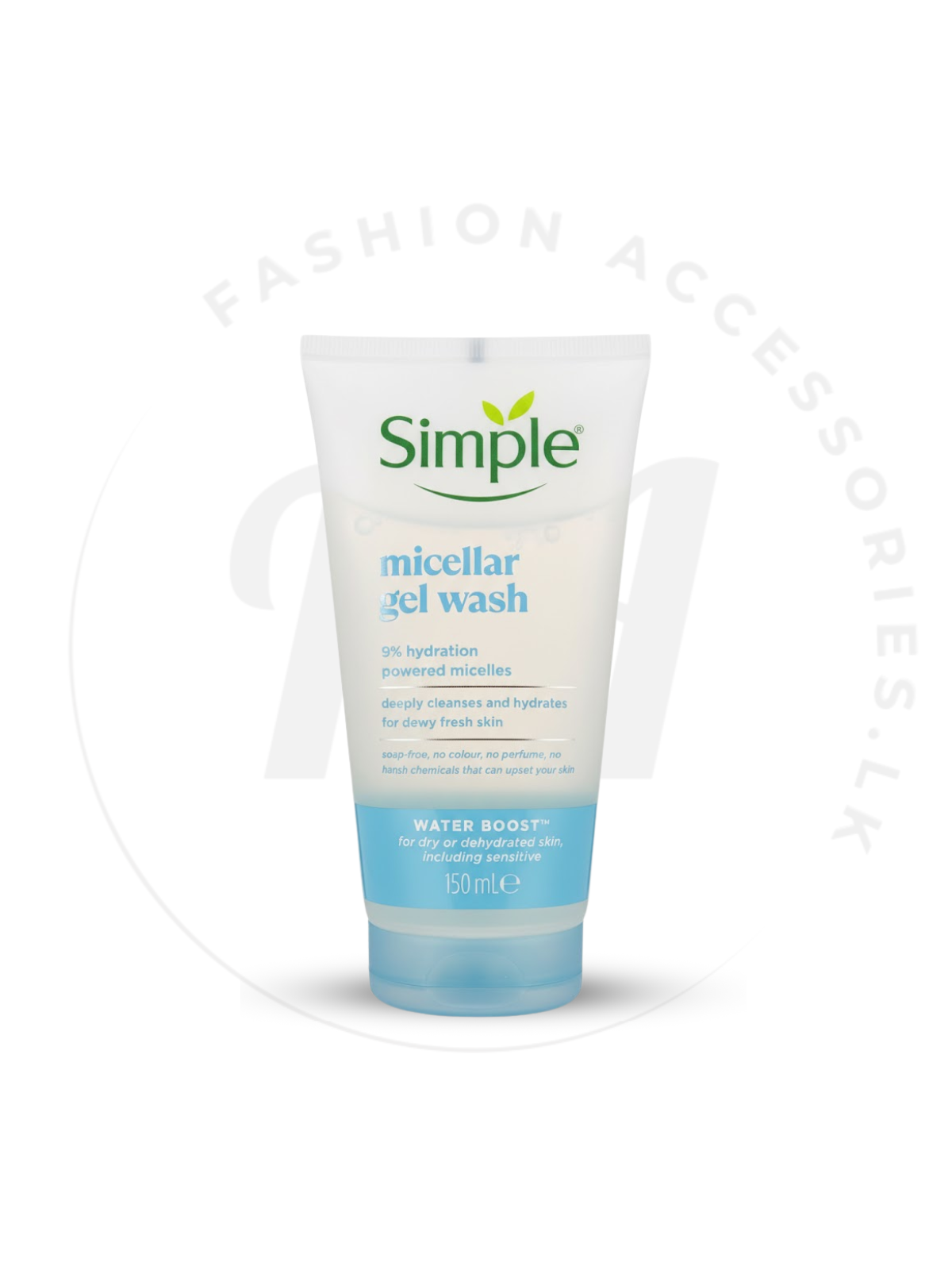 Simple Water Boost Micellar Facial Gel Wash 150ml is a refreshing, hydrating face cleanser designed to remove dirt, makeup, sweat, and impurities without drying or irritating the skin. Powered by micellar technology, it gently attracts and lifts away impurities while maintaining the skin’s natural moisture balance. Infused with skin-loving minerals, purified water, Pro-Vitamin B5, and Vitamin E, this gel wash delivers a smooth, gentle cleanse — perfect for sensitive skin and daily use. The lightweight gel texture feels soothing and leaves your skin fresh, soft, and revitalized after every wash. Free from artificial perfumes, dyes, alcohol, and harsh chemicals, making it suitable for all skin types, especially delicate or easily irritated skin.