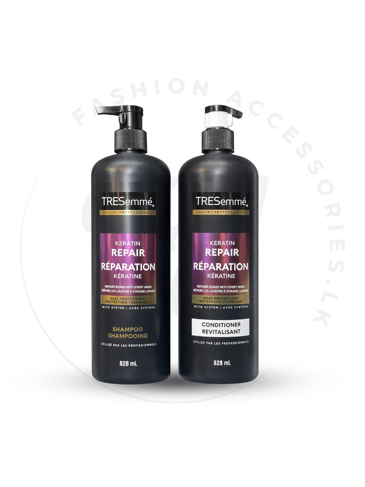 TRESemmé Keratin Repair Shampoo සහ Conditioner යනු කෙස් වල හානි යථා තත්ත්වයට පත් කරමින්, මෘදුකම හා ශක්තිය වැඩි කරන විශේෂිත සෙට් එකකි. Bond Plex තාක්ෂණය සහ Pro Style Technology එකතුව මගින් කෙස් ශක්තිමත් කරමින්, ගැටුණුකම් අඩු කරයි.