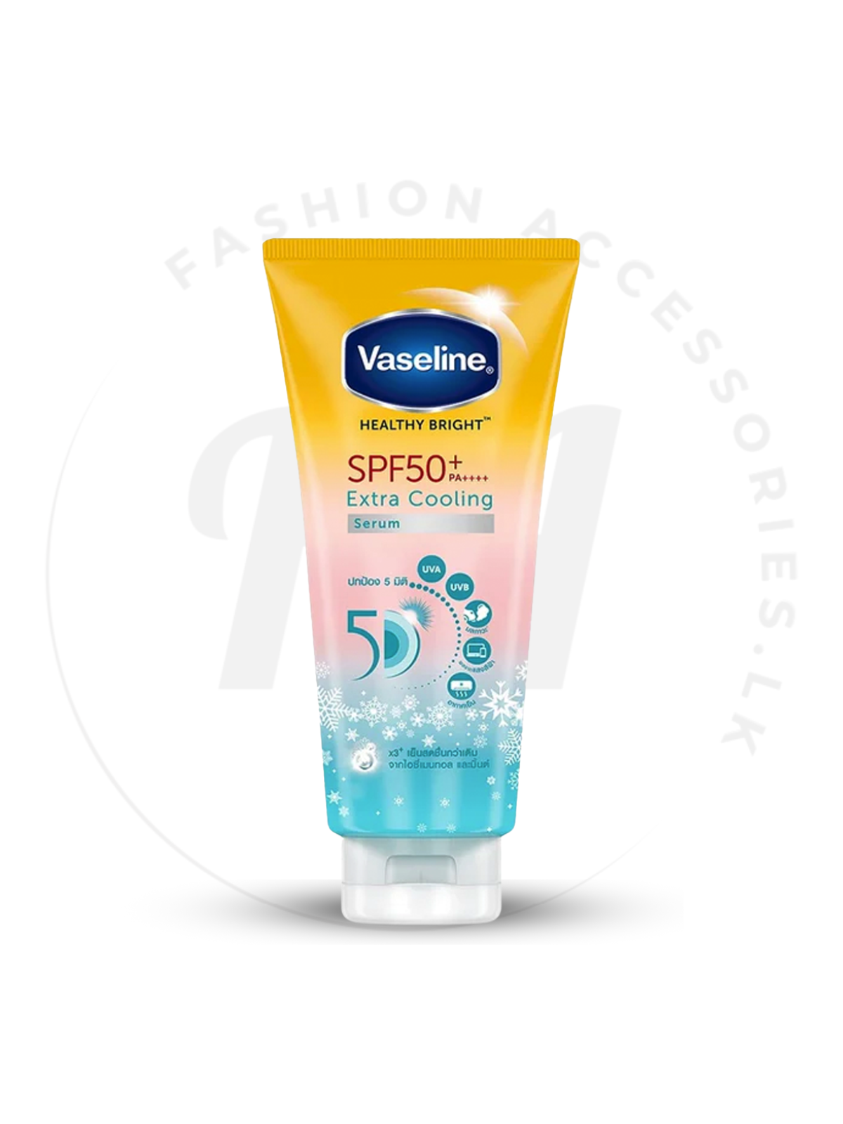 Vaseline Healthy Bright Extra Cooling Serum SPF 50+ යනු ශරීරයට භාවිතා කිරීම සඳහා නිර්මාණය කරන ලද, ශීතල කරන, පුළුල් පරාස SPF 50+ සහ PA++++ ආරක්ෂාව සපයන සන්ස්ක්‍රීන් සෙරමයක් වේ. මෙය නියාසිනමයිඩ්, Vaseline ජෙලී කුඩා නූල් වලින් හා මෙන්තෝල් සමඟ සවිබලගන්වා ඇති අතර, සමට වහාම දිදුලන සහ නව ජීවය ලබාදෙමින් ගැඹුරු ආර්ද්‍රතාවයක් සැපයෙයි.